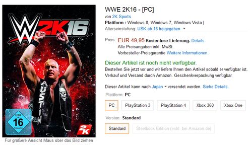 前作WWE 2K15に続き、WWE 2K16もPC版が登場する可能性が出てきました。 ドイツのアマゾンにPC版WWE 2K16の商品ページが登場しました。 前作WWE 2K15のPC版はsteamで販売されており、全てのDLCが付いているお得なバージョンとなっています。 WWE 2K16は予約特…